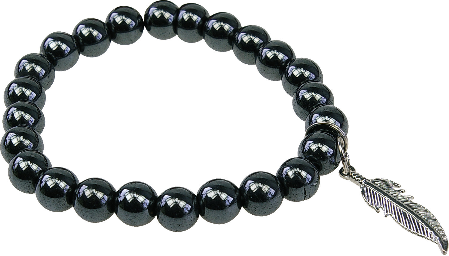 Bracelet Hématite Perles rondes 8 mm et Breloque plume