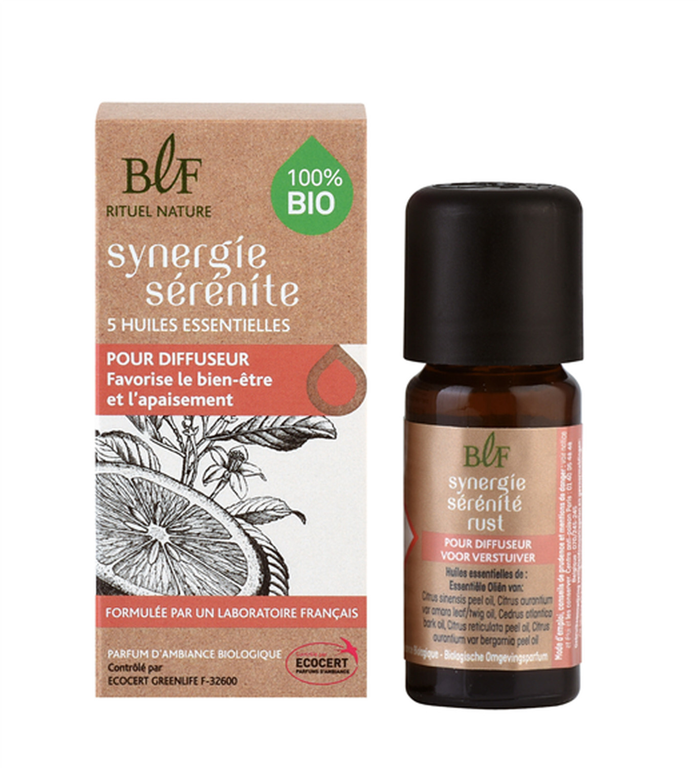 - Synergie de 5 huiles essentielles BIO Sérénité Bougies la Française [DESCRIPTION] Flacon pour diffuseur composé de 5 huiles essentielles 100% BIO : Orange douce, Petit grain bigarade, Cèdre, Mandarine, Bergamote. Ce complexe favorise le bien-être et l'apaisement. [CONSEILS D'UTILISATION] Verser quelques gouttes d'huiles dans un diffuseur adapté et diffuser par période de 10 à 20 min, 3 fois par jour. [PACKAGING] Boîte en carton imprimée. [PRÉCAUTIONS D'EMPLOI] Avant utilisation, lire attentivement les précautions d'emploi relatives aux pictogrammes de danger indiqués sur la notice et bien la conserver. Huiles essentielles labellisées PARFUM D'AMBIANCE BIO contrôlé par ECOCERT GREENLIFE F-32600.