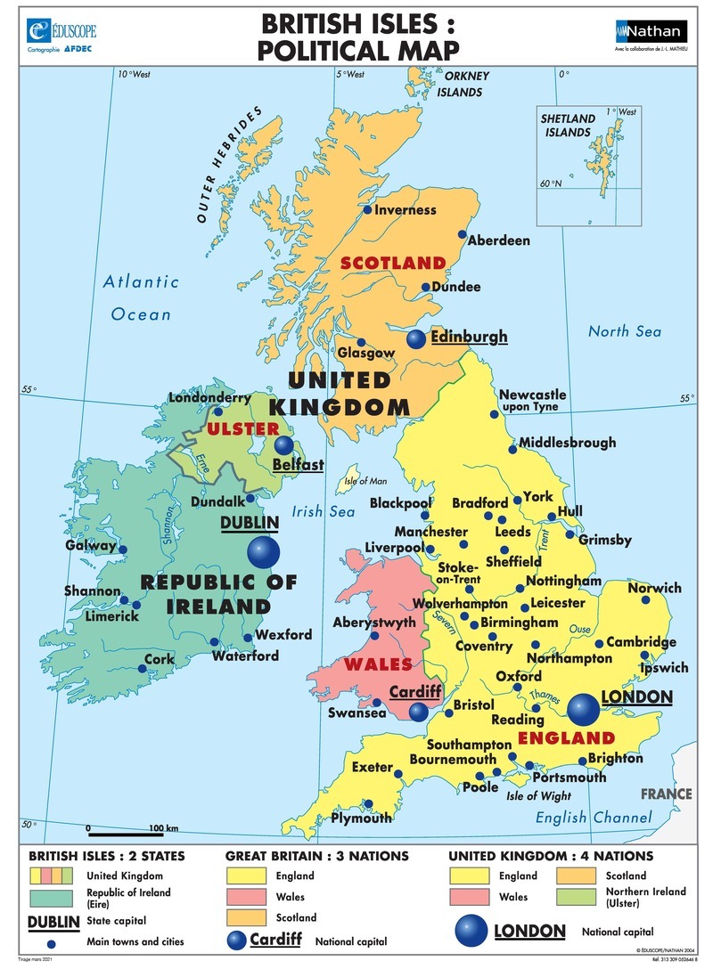 Collège et lycée. Face 1 : Les îles Britanniques en anglais : Carte politique des îles Britanniques : les deux États, les trois nations de la Grande-Bretagne, les quatre nations du Royaume-Uni. Face 2 : Les îles Britanniques en anglais : L'influence britannique dans le monde : les territoires britanniques, les pays de langue anglaise, les pays du Commonwealth.