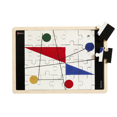 Puzzle composé de 35 pièces représentant : Sans titre de S. Taeuber-Arp. " Sans titre " de S. Taeuber-Arp. Une illustration riche et colorée, imprimée sur le bois, pour favoriser le langage. Modèle amovible recto verso : couleurs et noir et blanc. Cadre pour caler les pièces et faciliter le rangement.