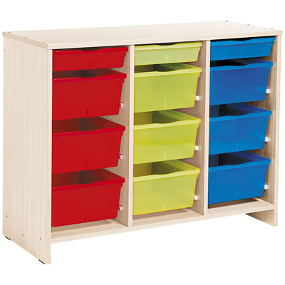 Un meuble bas, teinte bouleau et livré avec 12 bacs multicolores, qui peut être utilisé pour : - délimiter les espaces de vie dans la classe tout en conservant une bonne visibilité, - faciliter la mise en place des activités et favoriser l'autonomie des enfants. - Meuble bas livré avec 9 bacs profonds et 3 bacs plats multicolores (4 rouges, 4 verts, 4 bleus) qui se retirent et se replacent facilement sur les glissières. - Meuble bas livré avec le maximum de glissières prémontées pour pouvoir interchanger bacs plats et bacs profonds selon vos besoins. - Les bacs peuvent être rangés avec leur couvercle (vendus séparément) et sont facilement identifiables grâce aux porte-étiquettes repositionnables (vendus séparément).