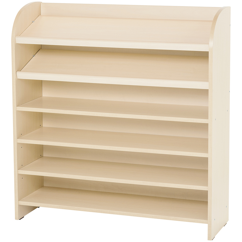 Grand meuble multi-étagères (teinte bouleau) pour mettre en avant livres, puzzles ou activité du jour. Ce meuble se compose de : 6 étagères dont 2 pivotantes pour la présentation du matériel, 2 fixes et 2 réglables. Il est autoportant, à installer contre un mur.