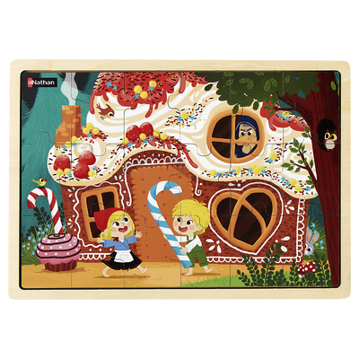 Un puzzle composé de 18 pièces sur le thème du conte : Hansel et Gretel. Un puzzle sur le thème d'un conte traditionnel à reconstituer avec modèle (amovible). Des illustrations riches et colorées, imprimées sur le bois, pour favoriser le langage. Cadre pour caler les pièces et faciliter le rangement.