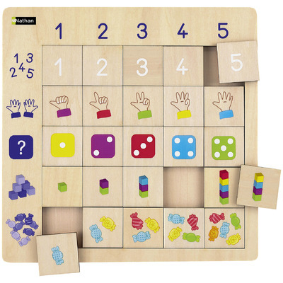 LudiTab Logique - Numération est un puzzle conçus sur le principe du tableau à double entrée pour aborder les premières notions de numération de 1 à 5. Puzzle conçus sur le principe du tableau à double entrée pour aborder les premières notions de numération de 1 à 5 : nombre, doigts de la main, constellation et collection. Conseil accompagnement du handicap : Initie aux tableaux à double entrée. Cadre contour pour maintenir les pièces en place.