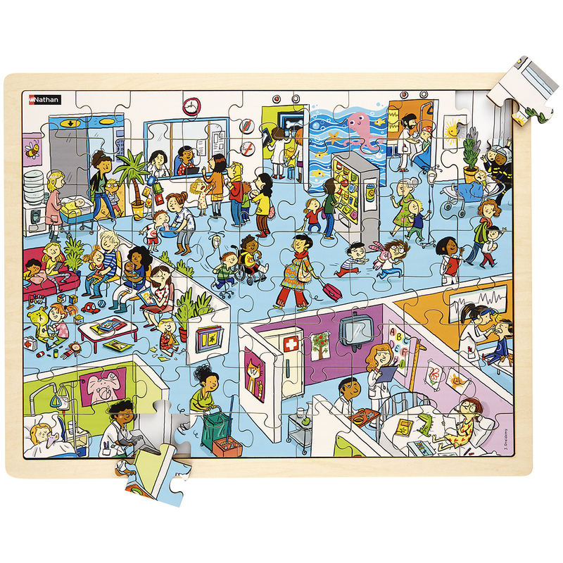 Un puzzle grand format de 72 pièces en bois verni sur le thème de l'hôpital. Une scène de la vie dans un hôpital fort réaliste et de grande dimension. Elle comporte de nombreux détails favorisant les situations de langage et d'observation. Illustrations imprimées directement sur le bois. Modèle en noir et blanc amovible.