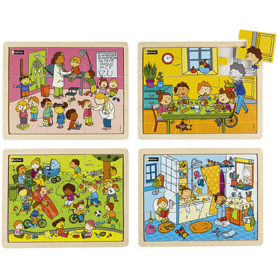4 puzzles composés chacun de 9 pièces en bois, sur les thèmes de l'hygiène, la santé, l'activité physique et le repas équilibré. Des puzzles sur le thème du " Bien grandir " à reconstituer avec ou sans le modèle. Des illustrations riches et colorées, imprimées sur le bois, pour favoriser le langage. Modèles en noir et blanc amovibles. Cadre pour caler les pièces et faciliter le rangement.