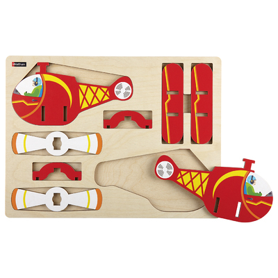 8 pièces en bois découpé et verni, à assembler pour construire l'hélicoptère. Cet encastrement original permet d'affiner la dextérité et d'initier à la lecture de schéma de montage. Des éléments en bois découpé et verni, à assembler selon le schéma de montage en quelques étapes, indiqué au dos du plateau. Les réalisations tiennent à la verticale. Démontage facile et rangement par encastrement simple des pièces sur le plateau.