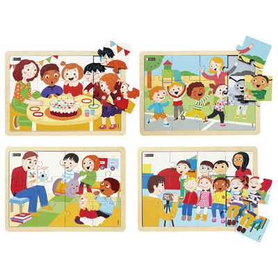 Les bons moments à l'école comprend 4 puzzles en bois de 12 pièces chacun : L'anniversaire + La photo + La victoire + L'histoire Ces puzzles peuvent être reconstitués avec ou sans les modèles (amovibles). 2 niveaux de difficultés progressives grâce aux modèles recto verso (couleurs ou noir et blanc). Des illustrations riches et colorées imprimées sur le bois favorisent le langage. Cadres pour caler les pièces et faciliter le rangement.