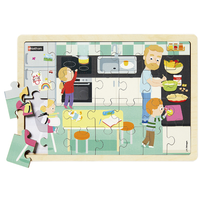 Un puzzle en bois de 28 pièces sur le thème de la cuisine. Ce puzzle sur le thème de la cuisine peut être reconstitué avec ou sans le modèle (amovible). 2 niveaux de difficultés progressives grâce au modèle recto verso (couleurs ou noir et blanc). Des illustrations riches et colorées imprimées sur le bois favorisent le langage. Cadre pour caler les pièces et faciliter le rangement.
