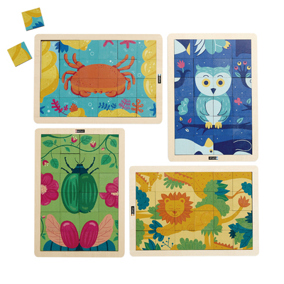 4 puzzles magiques de C. et J. Duhautois composés de 24 pièces chacun et représentant des reproductions : Le hibou et le manchot - Les girafes et le lion - Le crabe et le coquillage - Le scarabée et le doryphore Le graphisme vivant aux couleurs éclatantes stimule l'imagination et fait découvrir de nouveaux univers. Modèles en couleurs amovibles recto verso pour guider l'enfant.
