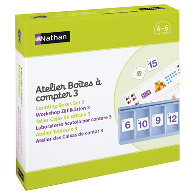 Atelier Boîtes à compter 3 pour 2 enfants est un atelier d'entraînement pour développer et consolider la connaissance des nombres de 0 à 16. En complément en bas de cette page, jouez en ligne avec la classe de Florent. Par la manipulation de jetons de nature différente, les enfants s'entraînent à reconnaître différentes représentations du nombre : collection témoin, constellation du dé, doigts de la main, écriture chiffrée. Les consignes sont présentées sous forme illustrée. Sur chaque fiche, un pictogramme indique le type de jetons à utiliser : jetons ronds, jetons constellations ou jetons écriture chiffrée. PROGRESSION DES ACTIVITÉS Elles s'organisent autour de 4 séries de 6 fiches de difficulté progressive. Chaque série propose quatre représentations du nombre et aborde un champ numérique progressif : Série rouge : de 0 à 6. Série verte : de 3 à 10. Série bleue : de 5 à 12. Série jaune : de 7 à 16. => En complément, jouez en ligne avec @classedeflorent : https://classedeflorent.fr/Nathan/index.php#compter Testé par @classedeflorent l'atelier : https://www.instagram.com/p/CiuRPXcq4-e/ le complément en ligne : https://www.instagram.com/p/CholjP1KRjc/ COMPÉTENCES DÉVELOPPÉES Dénombrer une collection. Construire une collection de quantité donnée. Associer un nombre à une collection. Reconnaître différentes représentations des nombres de 0 à 16.