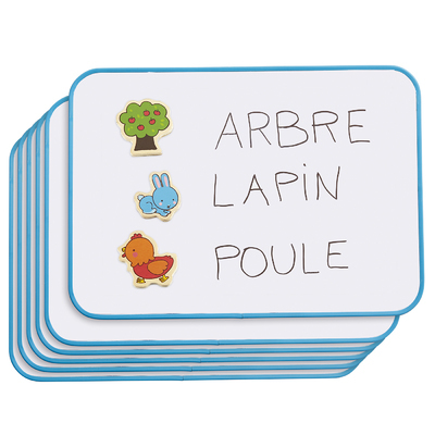 6 ardoises blanches pour écrire et/ou poser des éléments magnétiques. Facilite les activités quotidiennes de la classe. À utiliser avec des feutres effaçables, vendus séparément.