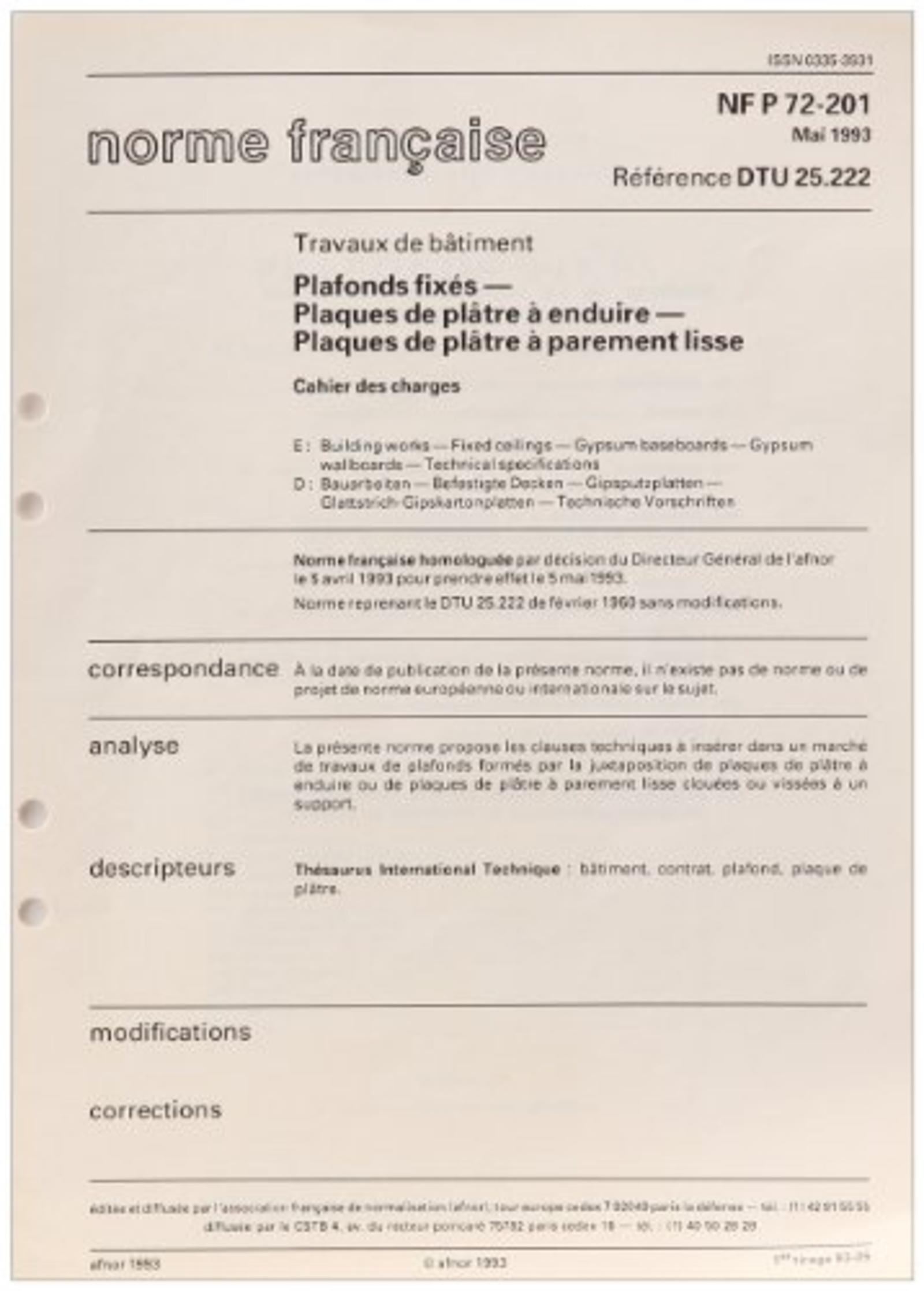 DTU 25.222 PLAFONDS FIXES. PLAQUES DE PLATRE A ENDUIRE. PLAQUES DE PAREMENT LISS