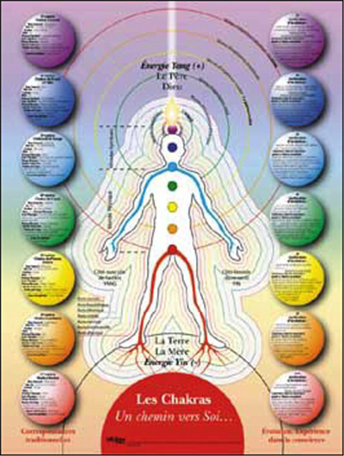 Ce POSTER, réalisé sur papier pelliculé brillant de 170 gr/m2 est au format 45 x 60 cm. Les 7 centres majeurs y sont représentés ainsi que des explications détaillées scindées en deux parties : La première partie regroupe les associations traditionnelles des Chakras. La deuxième partie explique l'évolution dans la conscience ainsi que l'expérience dans la conscience quand ce Chakra est optimal.