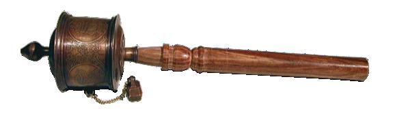 Cylindre rempli de mantras ( paroles énoncées par les bouddhas) que l'on fait tourner dans le but de répandre sur les êtres la bénédiction qui en émane.GM : 43 cm