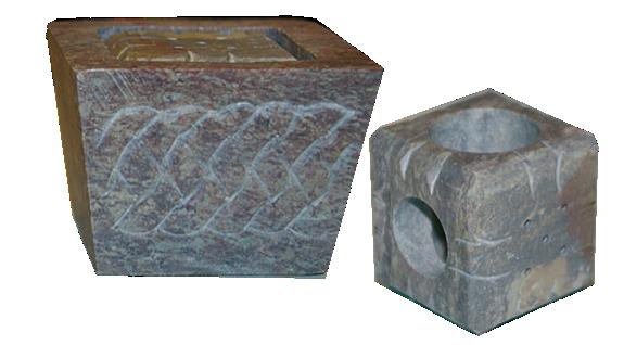Pierre ollaire : agglomérat de nombreux minéraux. Appelé en anglais "soapstone" à cause de son toucher savonneux. Hauteur : 4 cm, largeur : 5.5 cm. Diamètre trous pour bougies : 2.2 cm, 1.9 cm, 1.2 cm, 1 cm. 5 trous pour bâtonnets encens.