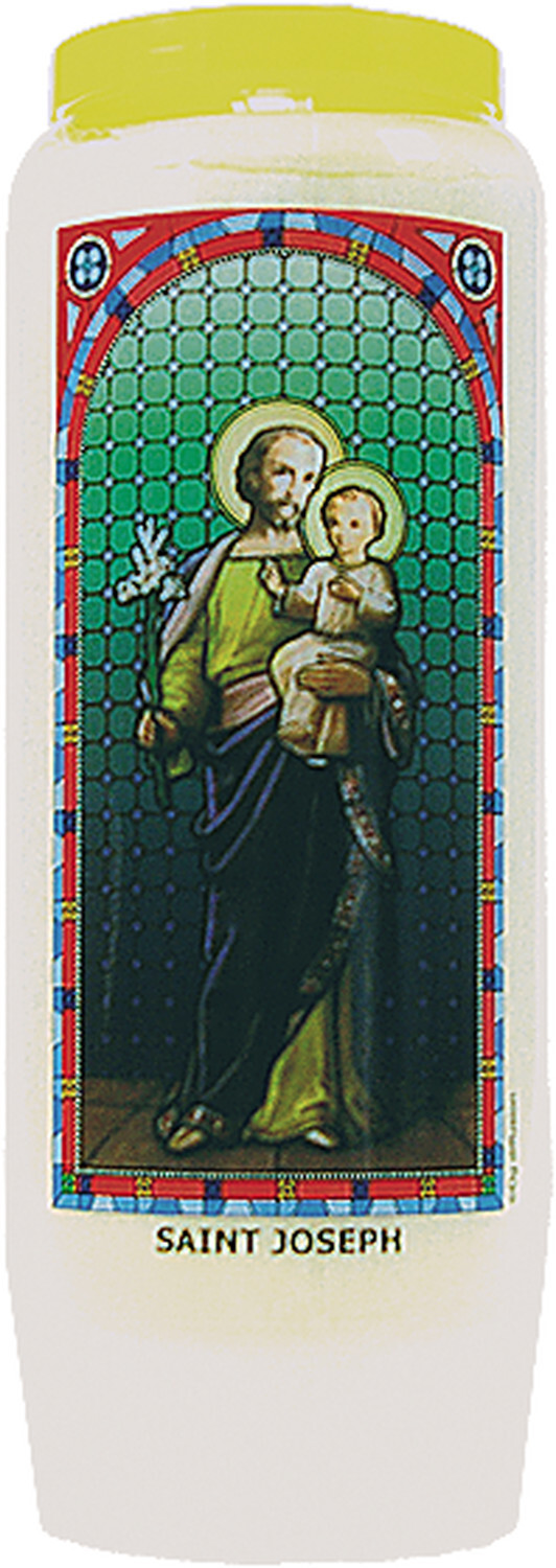 Neuvaine vitrail : Saint Joseph [DESCRIPTION] Ô Joseph, toi que la grâce divine a comblé ; Le Sauveur a reposé dans tes bras et grandi sous tes yeux ; Tu es béni entre tous les hommes et Jésus, l’Enfant est béni. Saint Joseph, donné pour père au Fils de Dieu, prie pour nous dans nos soucis de famille (...), de santé (...) et de travail (...), jusqu’à nos derniers jours, et daigne nous secourir à l’heure de notre mort. Amen. [CARACTÉRISTIQUES] 100 % huile végétale - Hauteur : 17.9 cm.