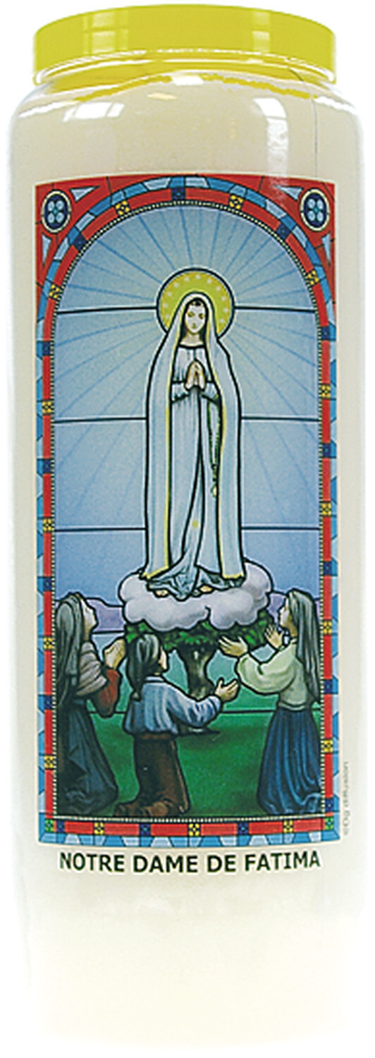 Neuvaine vitrail : Notre Dame de Fatima [DESCRIPTION] Notre Dame de Fatima Mère de Jésus et de l'Église Accordez-nous la lumière qui rayonne de votre bonté, le réconfort qui émane de votre Coeur immaculé, la charité et la paix dont vous êtes la Reine. Nous vous confions nos nécessités (nommer...) pour que vous les secouriez, nos douleurs (…) pour que vous les apaisiez, nos maux (…) pour que vous les guérissiez. Souvenez-vous, ô notre bonne Mère, que Jésus vous accorde tout ce que vous lui demandez. Amen. [CARACTÉRISTIQUES] 100 % huile végétale - Hauteur : 17.9 cm.