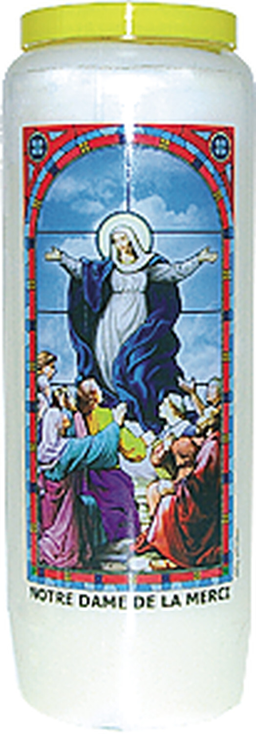 Neuvaine vitrail : Notre Dame de la Merci [DESCRIPTION] Vierge Marie, je viens te prier, Toi que j’appelle ici Notre Dame de la Merci. Tu me présentes ton Fils. Il me dit : ''Voici ta Mère''. Je suis et je veux rester ton enfant. Garde-moi la santé de l’âme et du corps. Garde la aussi à tous ceux qui me sont chers. (je prie spécialement aujourd’hui pour...) Aide-nous à être fidèles à la foi de notre baptême, et obéissants à tout ce que ton fils nous demande. Donne-nous d’aimer tous ceux qui nous entourent. Que notre amour rayonne de bonté, de compréhension et d’indulgence. Aide-nous à servir toujours davantage nos frères. Soutiens-nous dans les épreuves telles que (...). Ô Vierge de la Merci, ô ma Mère du ciel, je m’adresse à toi avec un coeur d’enfant. Prie pour nous ton Fils Jésus. Amen. [CARACTÉRISTIQUES] 100 % huile végétale - Hauteur : 17.9 cm.