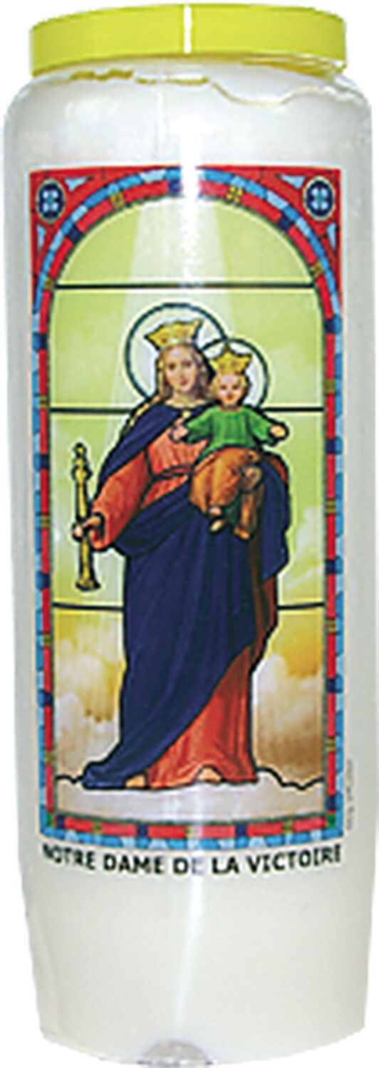Neuvaine vitrail : Notre Dame de la Victoire [DESCRIPTION] Notre Dame de la Victoire, Vous qui autrefois avez guéri, Daignez encore aujourd’hui Entendre nos appels insistants Je sollicite votre miséricorde pour (une guérison, une réconciliation) J’ai vraiment confiance En la bonté de votre Coeur Immaculé Et je sais que vous accueillerez ma demande. Amen. [CARACTÉRISTIQUES] 100 % huile végétale - Hauteur : 17.9 cm.