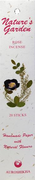 Encens Auroshikha, collection « Nature's Garden ». Parfum Rose. Lot de 5 paquets contenant chacun 20 bâtonnets. Encens Indien de haute qualité conçu dans le plus grand respect de la tradition, des hommes et de l'environnement. Les fragrances de ces encens proviennent de différentes fleurs, de feuilles, d'écorces, de racines, d'herbes, d'épices, de résines naturelles ainsi que d'huiles essentielles pures. Chaque étui est réalisé en papier artisanal recyclé, puis est décoré individuellement à la main de fleurs naturelles. En choisissant cette gamme, vous soutenez la Udavi Gentillesse School, une école de la région d'Auroville en Inde du Sud.