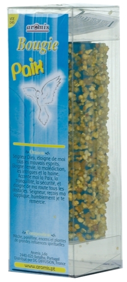 Bougie vendue avec oraison. Dimension : hauteur : 15 cm, diamètre : 5,8 cm