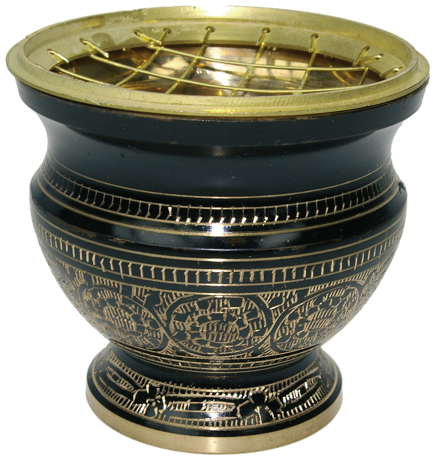 Brûle-encens laiton [DESCRIPTION] Coloris noir - Haut. [CARACTÉRISTIQUES] Diamètre : 8,1 cm - Hauteur : 7,5 cm - Laiton doré et noir.