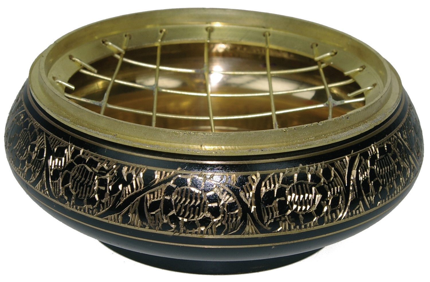 Brûle-encens laiton [DESCRIPTION] Coloris noir - Grand modèle. [CARACTÉRISTIQUES] Diamètre : 9,3 cm - Hauteur : 3,7 cm - Laiton doré et noir.