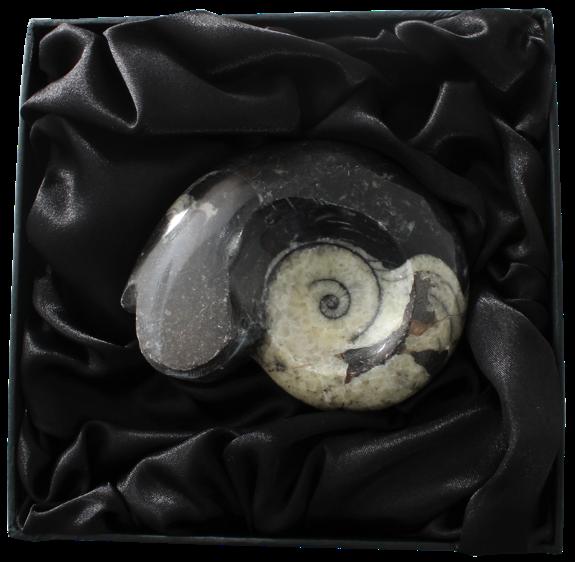 Les goniatites étaient des animaux marins possédant une coquille caractéristique, dont les chambres étaient séparées par des sutures en zig zag. L'animal vivait dans la chambre la plus grande et les autres, remplies de gaz, avaient un rôle hydrostatique. Les goniatites nageaient en pleine eau, possédaient des yeux et des tentacules bien développés. Taille : environ 9 cm - Age : 225-345 millions d'années - Provenance : Maroc. Vendu dans une boîte.