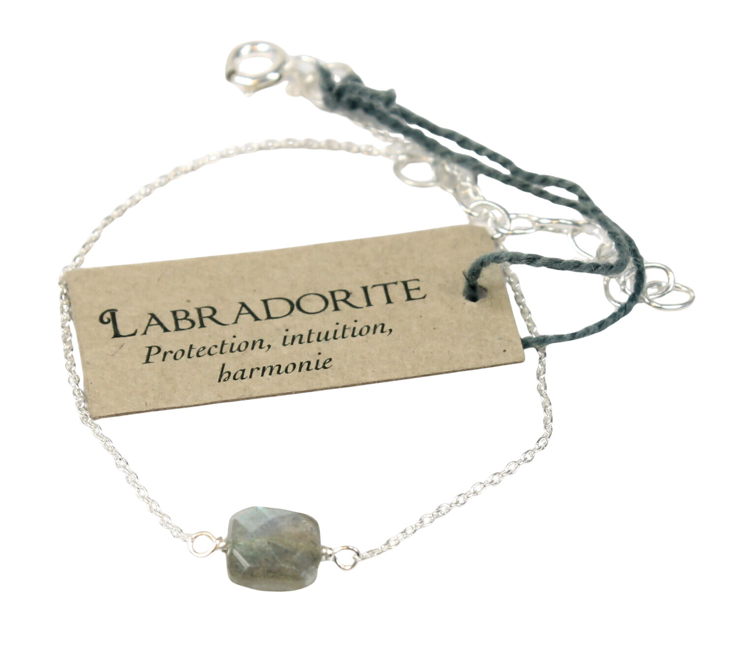 Bracelet coussin de Labradorite 7 mm - Argent 925 [DESCRIPTION] Labradorite taillée en coussin, montée sur un bracelet en argent 925 millièmes. Ce bijou très fin s'adaptera à tous les poignets de par sa chaîne à maillons réglables. [PACKAGING] Cartonnette en carton accrochée au produit avec un fil