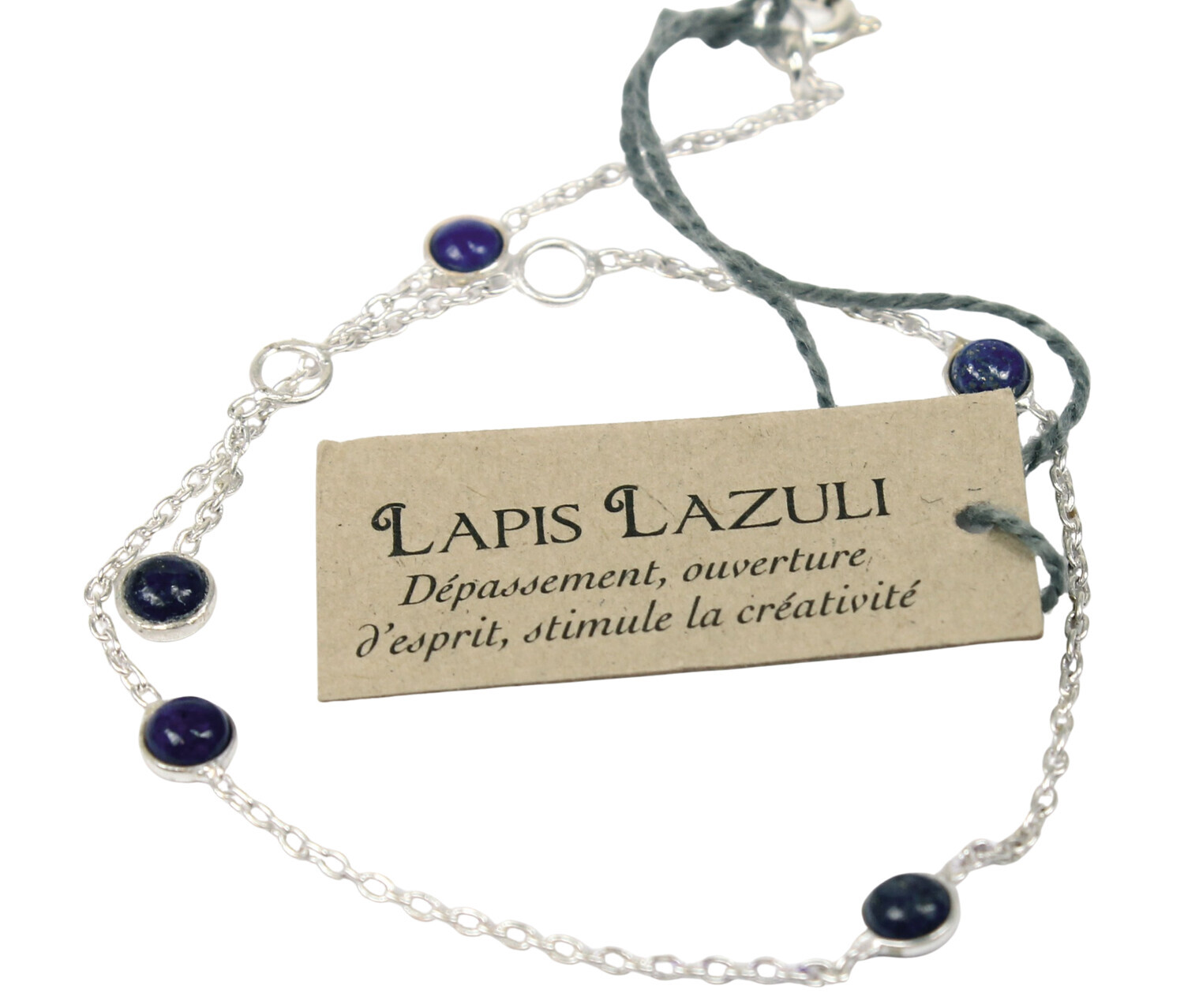 Bracelet pierres Lapis lazuli 4 mm - Argent 925 [DESCRIPTION] Bracelet en argent monté avec 4 petites pierres de Lapis Lazuli taillées.Taille des pierres : 4 mm. [PACKAGING] Cartonnette en carton accrochée au produit avec un fil