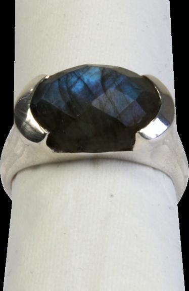 Bague en argent, taille 57, avec pierre de Labradorite taillée facettée. Taille pierre : 1 cm x 1,4 cm.