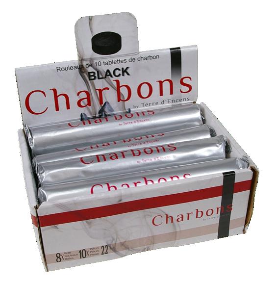 Coffret présentoir de charbons noirs "Terre d'encens" comprenant 8 rouleaux hermétiques de 10 tablettes de charbons mesurant chacune 22 mm, et destinés à l'accomplissement du rituel du narguilé ou de l'encens. Ce présentoir est prêt à l'emploi pour votre lieu de vente.