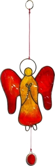 Attrape soleil ange de couleur rouge, orange et jaune en verre, et d'où suspend un petit galet de verre serti. Le manque de soleil peut influencer fortement notre humeur. Attachez un attrape soleil devant votre vitre afin de profiter des doux rayons du soleil. Vous apprécierez les reflets qu'ils projetteront dans votre foyer, autant de couleur et de gaieté pour vos journées. La manière dont le verre a été coulé lors de la création de l'attrape soleil lui permet de refléter la lumière dans toutes les directions. Les aspérités crées intentionnellement lui permettent d'être actif à la fois sur votre caractère et sur votre santé.
