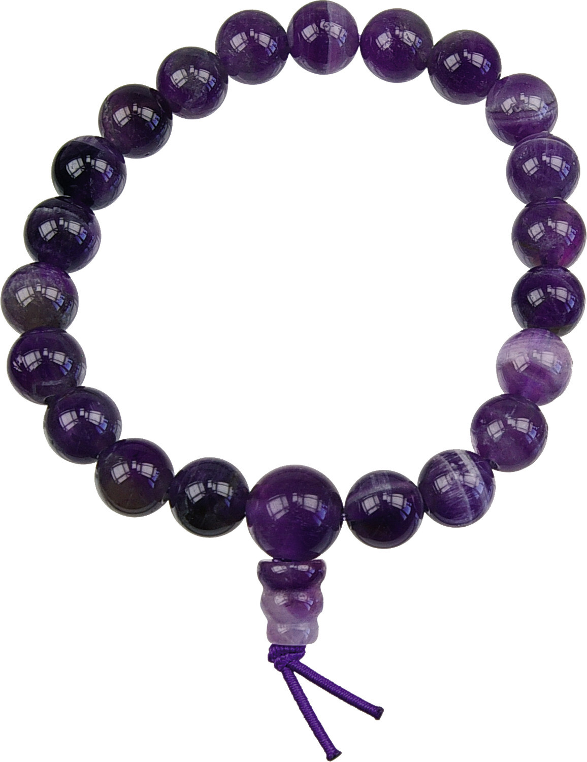 Mala signifie en sanskrit «collier de fleurs» ou «guirlande de perles». Ces bracelets sont composés de 21 perles en pierre naturelle. Les moines et les pratiquants bouddhistes le portent, comme il est d'usage, à leur poignet gauche. La plus grosse perle (ou «bille de tête») représente la connaissance de la vacuité. Le petit cône qui la surmonte est le symbole de la vacuité elle-même. Diamètre intérieur bracelet : 5 cm. Diamètre boule : 8 mm. L'améthyste ouvrira votre imaginaire et favorisera les rêves. Elle développe l'intuition, dissipe les peurs irraisonnées et vous offrira un sommeil sain et réparateur.