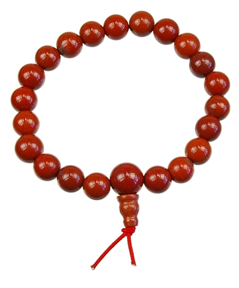 Mala signifie en sanskrit «collier de fleurs» ou «guirlande de perles». Ces bracelets sont composés de 21 perles en pierre naturelle. Les moines et les pratiquants bouddhistes le portent, comme il est d'usage, à leur poignet gauche. La plus grosse perle (ou «bille de tête») représente la connaissance de la vacuité. Le petit cône qui la surmonte est le symbole de la vacuité elle-même. Diamètre intérieur bracelet : 5 cm. Diamètre boule : 8 mm. Le jaspe rouge est un allié pour sortir des périodes de grande fatigue nerveuse ou physique. Il vous redonnera l'énergie et le courage pour vous affirmer et affronter les difficultés de la vie.
