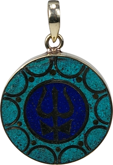 Superbe pendentif rond en métal argenté sur lequel est représenté le symbole du trident tibétain et orné de turquoise. Le Trident est l'arme et le symbole de Shiva. Dans le Bouddhisme il est le symbole de Triratna, les Threefold Jewel : Buddha, Dharma, et Sangha.Diametre : 2.8 cm