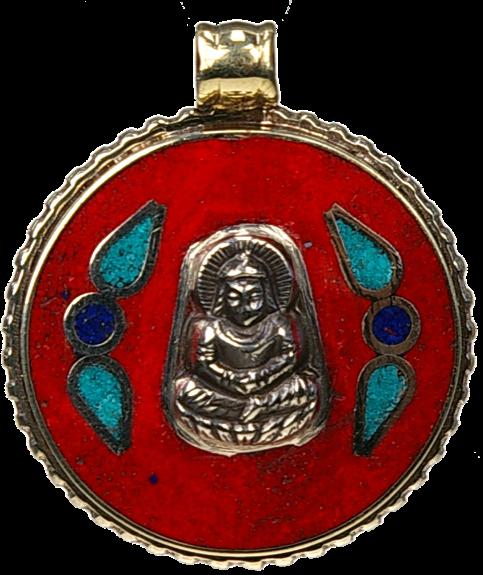 Superbe pendentif tibétain rond en métal argenté sur lequel est représenté Bouddha ainsi que les 3 joyaux, le tout garni de corail rouge. Bouddha est un mot qui vient de la langue sanskrit et qui signifie «un éveillé». La définition du mot est simple: Un bouddha est une personne qui a réalise l'illumination spirituelle qui apporte la libération de la souffrance.