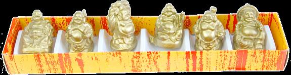 Assortiment de 6 bouddhas chinois à poser ou à suspendre en résine dorée. Les 6 bouddhas sont livrés emballés dans une boite.Hauteur moyenne de chaque pièce : 3 cm