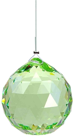 Véritable boule de cristal facettée Strass Swarovski de couleur péridot light (vert clair) représentant le Chakra Hanahata. Diamètre 30 mm, montée sur un fil de nylon pour être suspendue près d'une fenêtre ou dans un espace éclairé afin de diffuser la lumière captée.