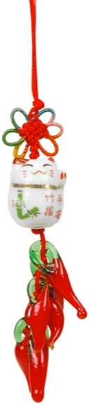 Amulette chat blanc Maneki Neko en porcelaine reliée à des piments rouges par une cordelette. Porte bonheur chinois, apporte chance et richesse. Idéalement se tient en main ou peut aussi s'accrocher sur un objet ou dans un lieu où l'on souhaite obtenir les vertus prétendues. Hauteur du pendentif : 6,5 cm sans le cordon, et 12 cm avec le cordon. Livré en lot de 3 exemplaires.