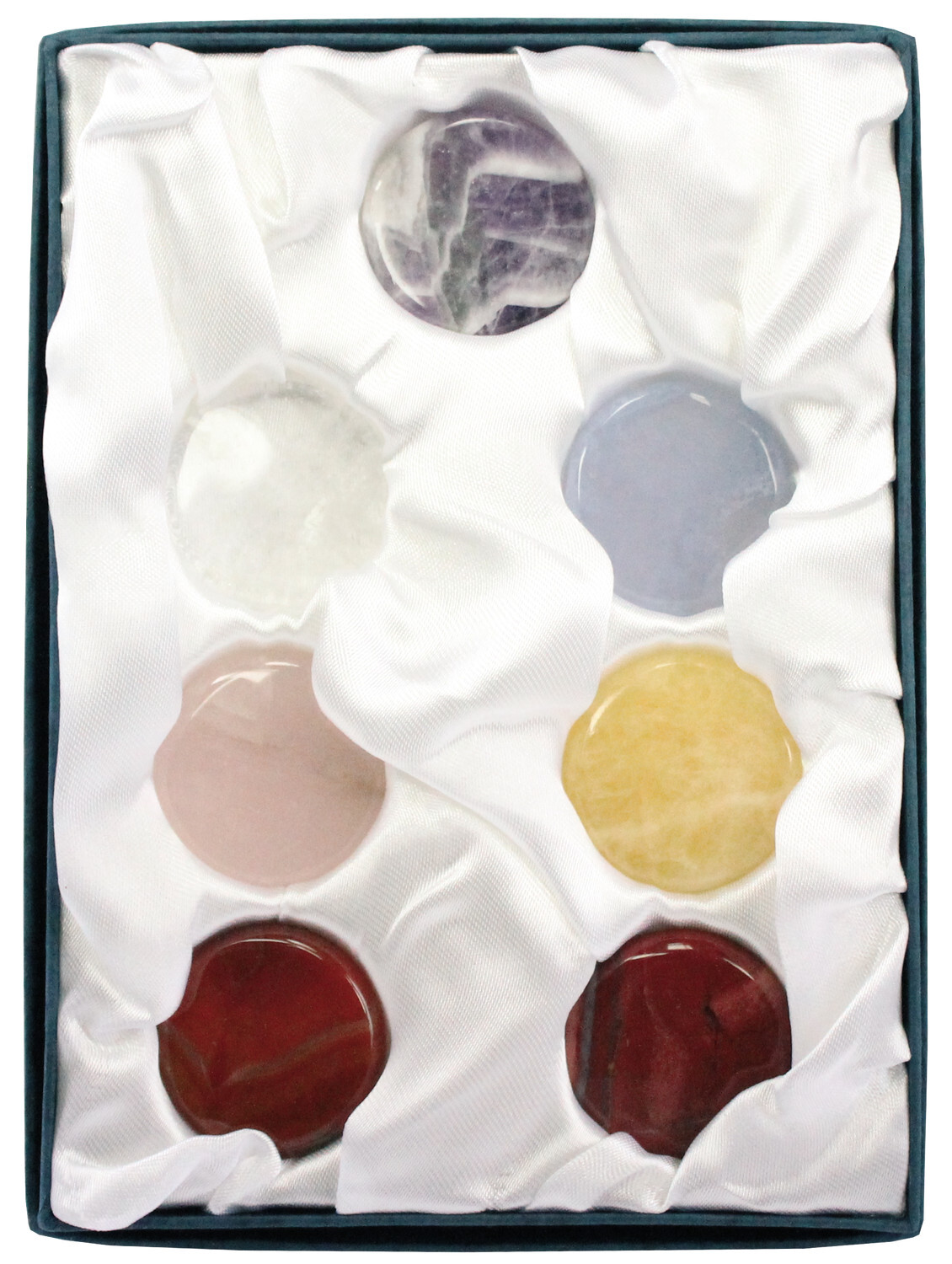 Set de galets des 7 chakras + livret explicatif en français. Améthyste, Cristal de roche, Calcédoine bleue, Quartz rose, Calcite orange, Cornaline, Jaspe rouge.