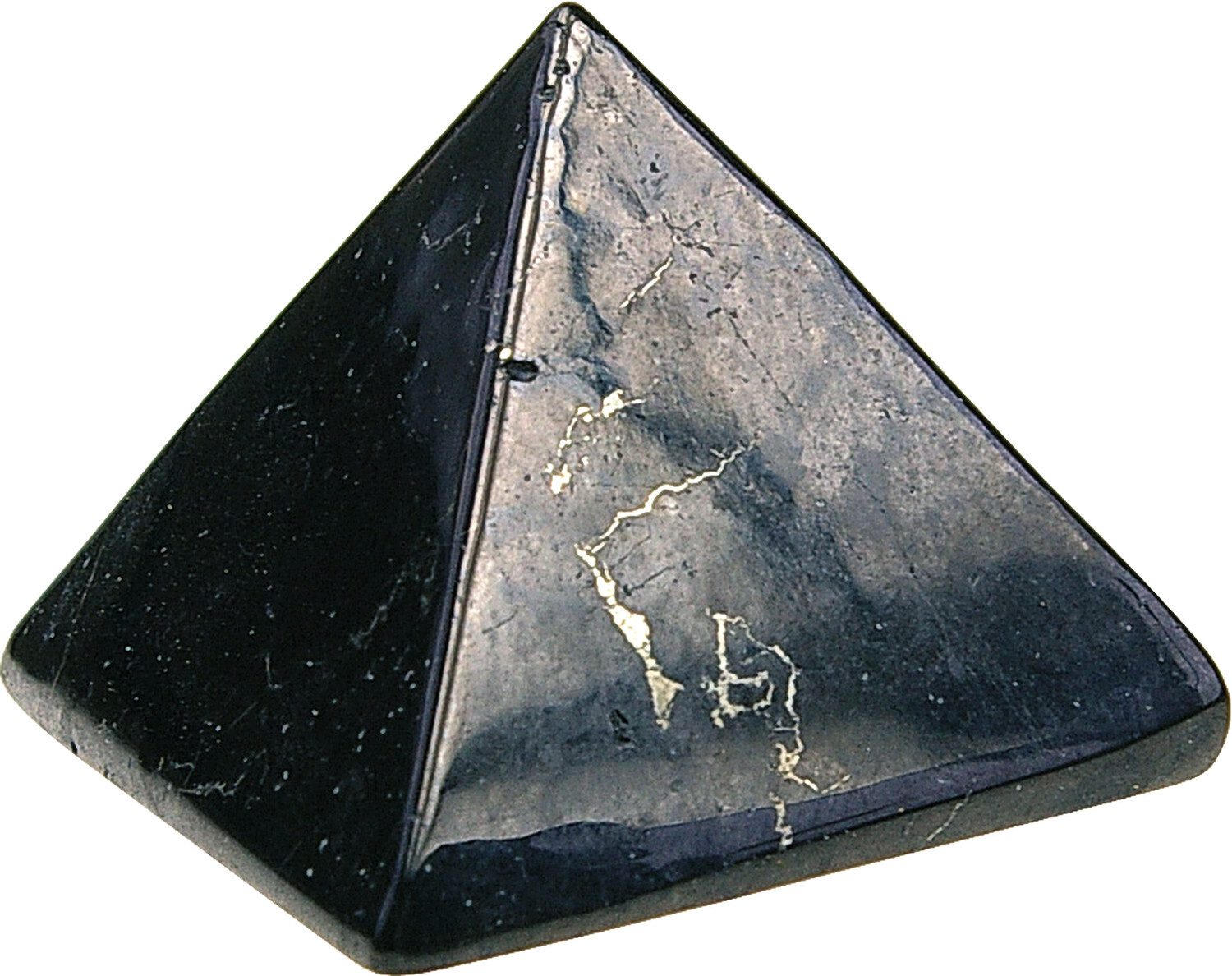 Pyramide Shungite : la pièce de 30 mm. La Shungite est le plus ancien charbon connu, d'origine planctonique. Unique dans sa composition, sa structure et ses propriétés. Il s'agit d'une minéralisation naturelle avec une distribution homogène de particules de silicates cristallins dans une matrice de carbone. On le trouve dans un seul endroit au monde : près du lac Onega Shunga en Russie, un lac d'une grande pureté. La Shungite développe un bouclier de rayonnement électromagnétique de haute fréquence vibratoire mesurable. L'industrie dans le monde entier commence à s'intéresser aux propriétés exceptionnelles de la Shungite. En France, la Shungite à été intégrée avec succès dans une céramique ajointe aux éoliennes, les animaux eux-mêmes dans des champs et fermes environnantes ont ainsi été calmés des perturbations électromagnétiques engendrées par les éoliennes. La Shungite constitue un blindage exceptionnel pour les rayonnements électromagnétiques nocifs de toute origine, comme les ordinateurs, fours à micro-ondes, téléviseurs, téléphones portables ou influences négatives ésotériques. La shungite possède aussi d'étonnantes propriétés sur tous les organismes vivants. Globalement, elle améliore, protège, neutralise et régénère. Des études scientifiques russes démontrent ses étonnantes capacités bactéricides et régénèrantes qui rendent une eau souillée en eau potable, cette action s'étend bien entendue dans l'organisme humain.