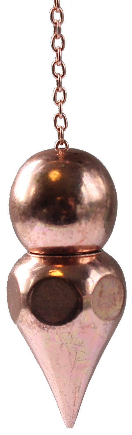 Pendule en cuivre, composé d'une sphère surmontant un cône. Monté avec une chaîne. Diamètre : 1,4 cm. Hauteur : 3,5 cm.