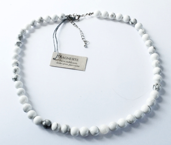 Collier ras de cou, d'environ 40 cm de longueur, composé de perles de 8 mm de diamètre, en magnésite. Vendu à l'unité. C'est une pierre qui apaise, détend, redonne l'harmonie. Le centre énergétique de prédilection de la magnésite est le chakra de la base.
