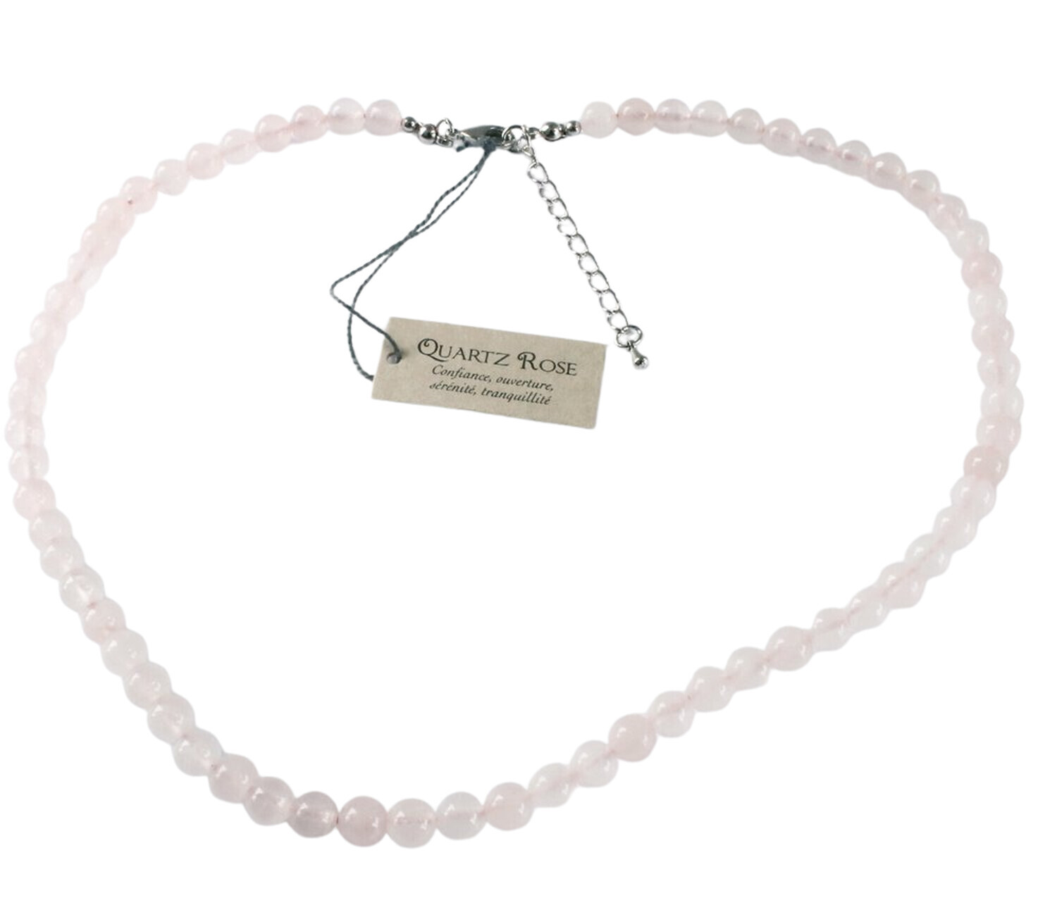 Collier ras de cou, d'environ 40 cm de longueur, composé de perles de 8 mm de diamètre, en quartz rose. Vendu à l'unité. Le quartz rose apprend à s'aimer, réduit le stress, apporte la joie. Il est très apprécié de la plupart des personnes pour sa douceur et l'aide qu'il apporte sur l'acceptation de soi.