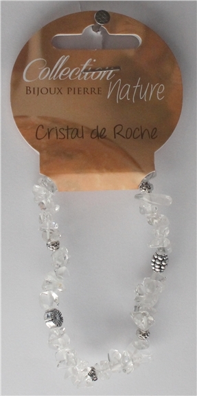 Bracelet de perles baroques de cristal de roche monté sur élastique silicone, avec quelques éléments décoratifs en métal argenté. Diamètre du bracelet 5,5cm. Vendus par lot de 6 ex.
