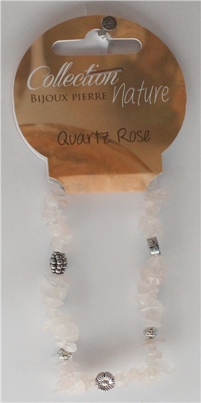 Bracelet de perles baroques de quartz rose monté sur élastique silicone, avec quelques éléments décoratifs en métal argenté. Diamètre du bracelet 5,5cm. Vendus par lot de 6 ex.