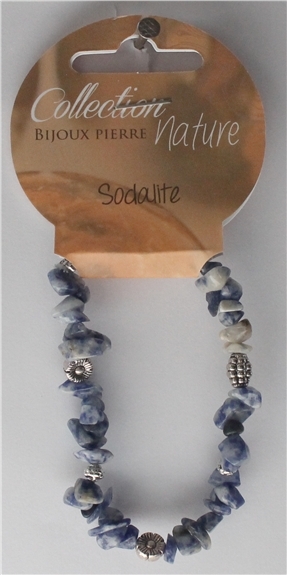 Bracelet de perles baroques de sodalite monté sur élastique silicone, avec quelques éléments décoratifs en métal argenté. Diamètre du bracelet 5,5cm. Vendus par lot de 6 ex.