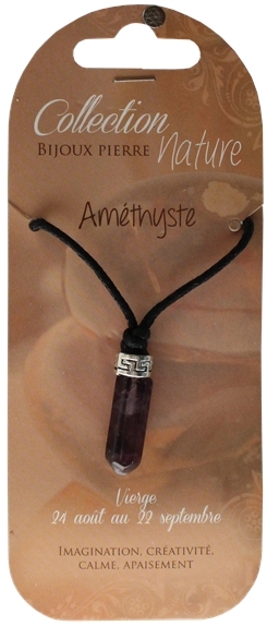 Pendentif pointe polie d'améthyste monté sur cordon noir. Hauteur de la pointe : 3 cm. Vendus par lot de 6 ex.